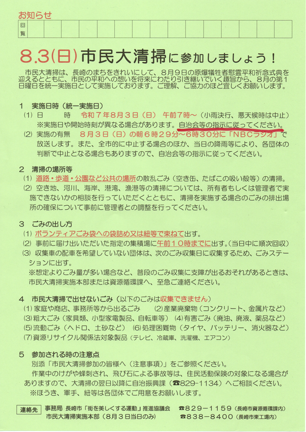 - 令和7年度の長崎市民大清掃は8月3日(日)の実施です。