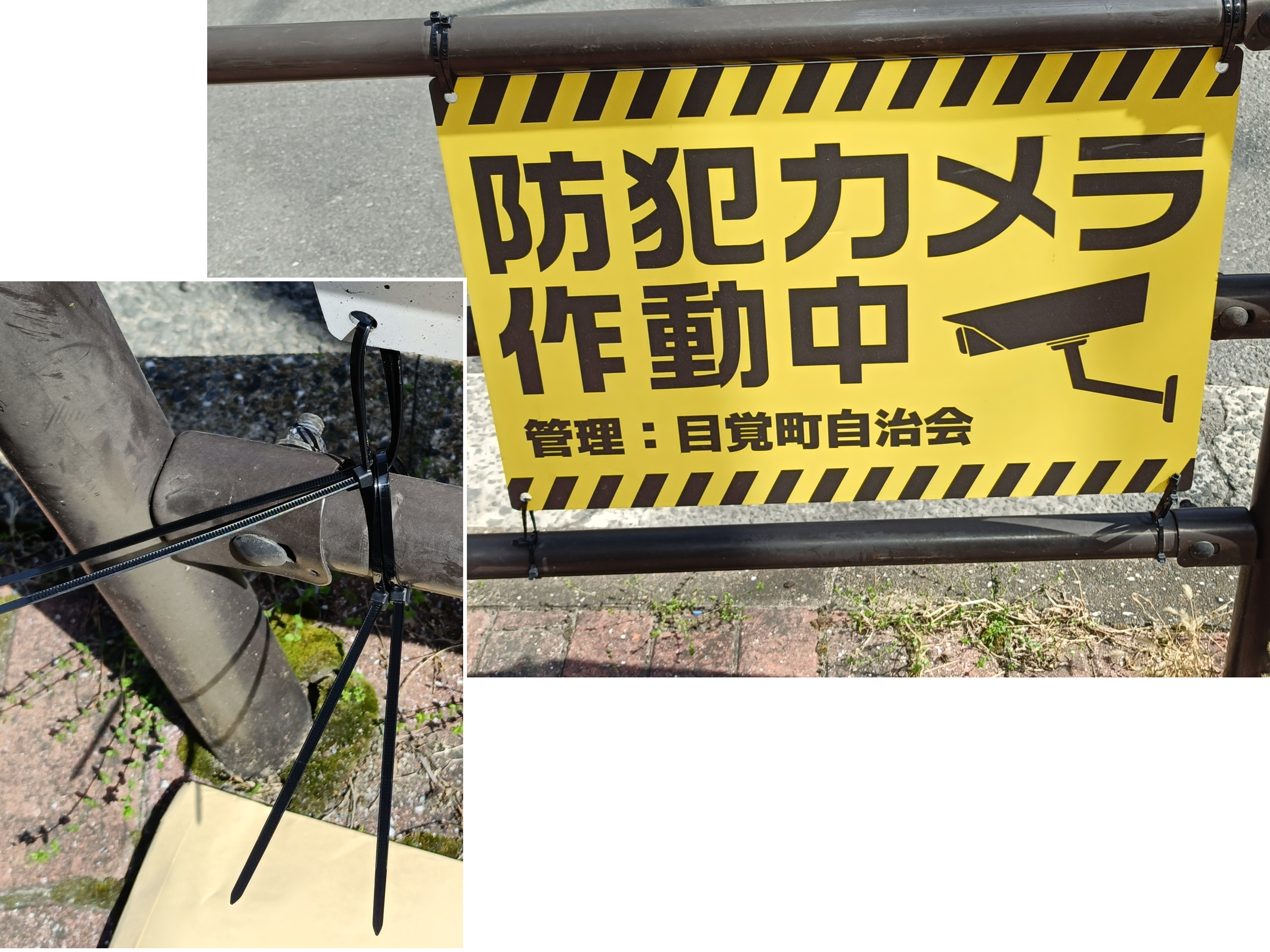 「防犯カメラ作動中」の看板を取り付けている結束バンドが4~5ヶ月で切れるので結束バンドの交換を行いました。防犯カメラを設置してから交差点での事故が激減しました。