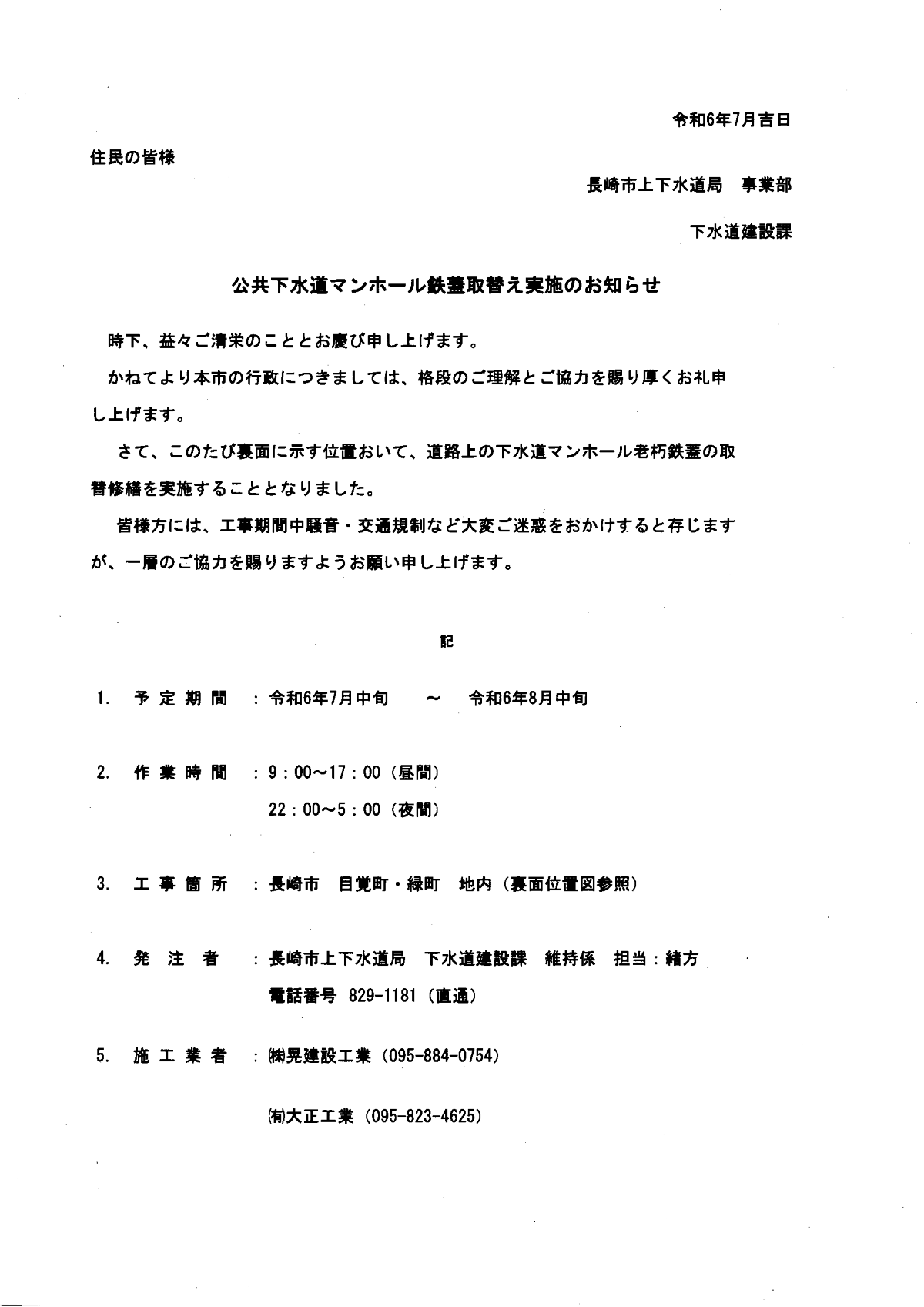 長崎市上下水道局 下水道建設課より表記案内がありましたのでお知らせします。