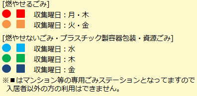 燃やせるごみは月・木曜日/燃やせないごみ・資源ごみ等は水曜日